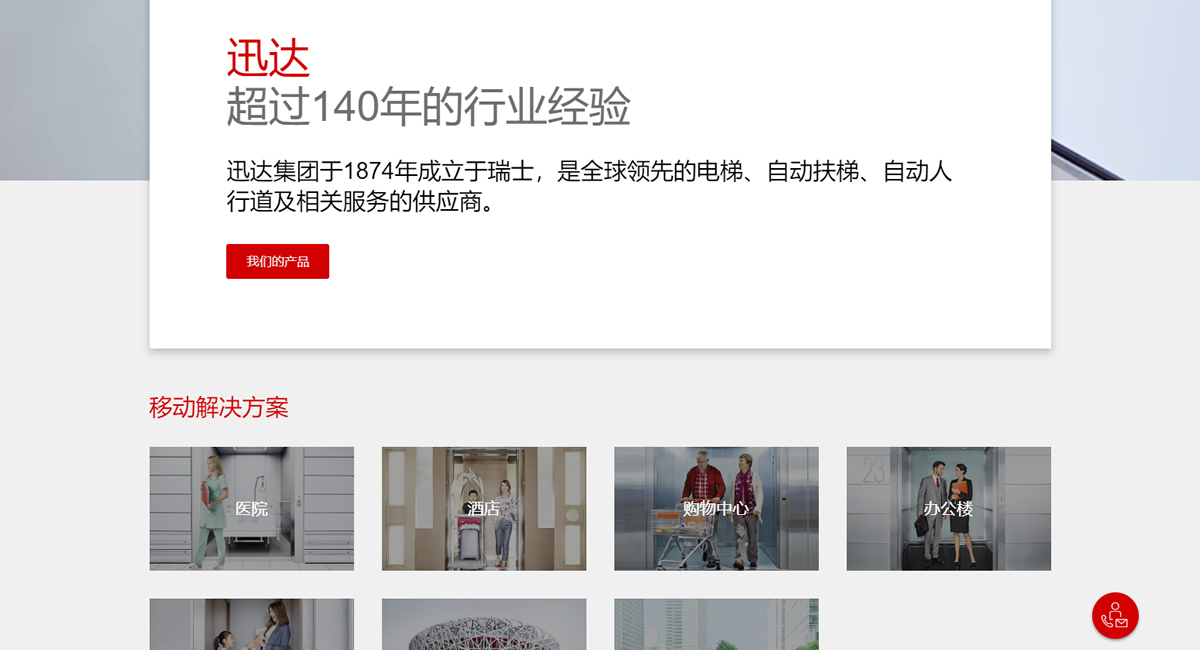 迅達(dá)集團(tuán)于1874年成立于瑞士,是全球領(lǐng)先的電梯、自動(dòng)扶梯、自動(dòng)人行道及相關(guān)服務(wù)的供應(yīng)商。超過60000名迅達(dá)員工遍布于全球100多個(gè)國家和地區(qū),在歐洲、巴西、美國、中國和印度設(shè)有五大生產(chǎn)基地。