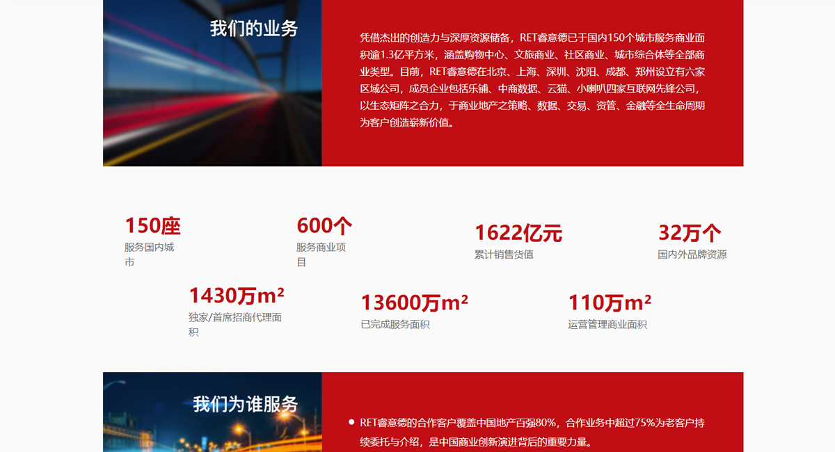 RET睿意德是中國商業(yè)數(shù)字化服務(wù)引領(lǐng)者,亦是持續(xù)推動行業(yè)革新進(jìn)化的領(lǐng)導(dǎo)者。為開發(fā)企業(yè)、公共機(jī)構(gòu)、零售品牌提供項目開發(fā)、租售和運(yùn)營的全過程的策略咨詢和落地執(zhí)行服務(wù)。憑借領(lǐng)先思維和前沿數(shù)字化技術(shù)為領(lǐng)先企業(yè)提升核心競爭力,以及精進(jìn)行業(yè)效能。在我們看來能夠通過合作,成為客戶的價值伙伴,是共同并肩創(chuàng)變行業(yè)的最有效途徑。為每一個項目全力以赴,視客戶目標(biāo)為必達(dá)目標(biāo),為睿意德與客戶提供了應(yīng)用和精進(jìn)我們的創(chuàng)新思維及數(shù)字化力量最難得的機(jī)會,這使得每一個工作日程都因更有挑戰(zhàn),而變得新鮮、有趣,每一次目標(biāo)的達(dá)成,也為著眼于未來的新目標(biāo),帶來更多可能的思考與策略。